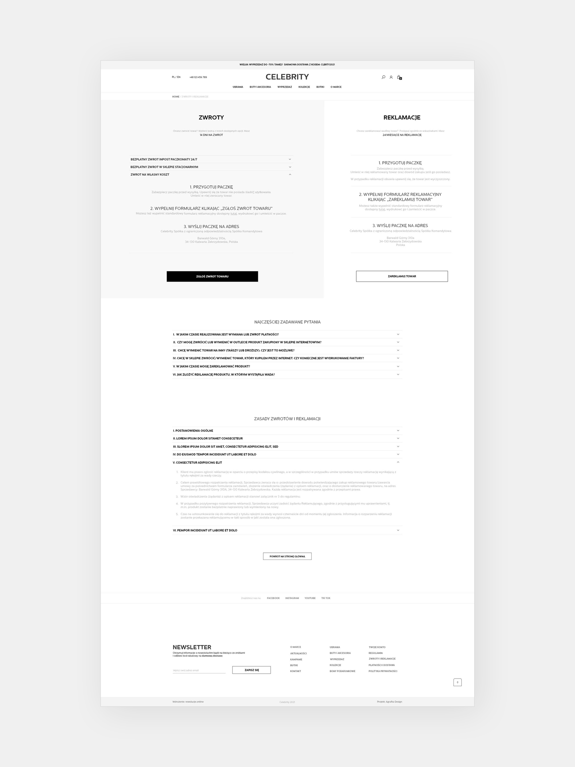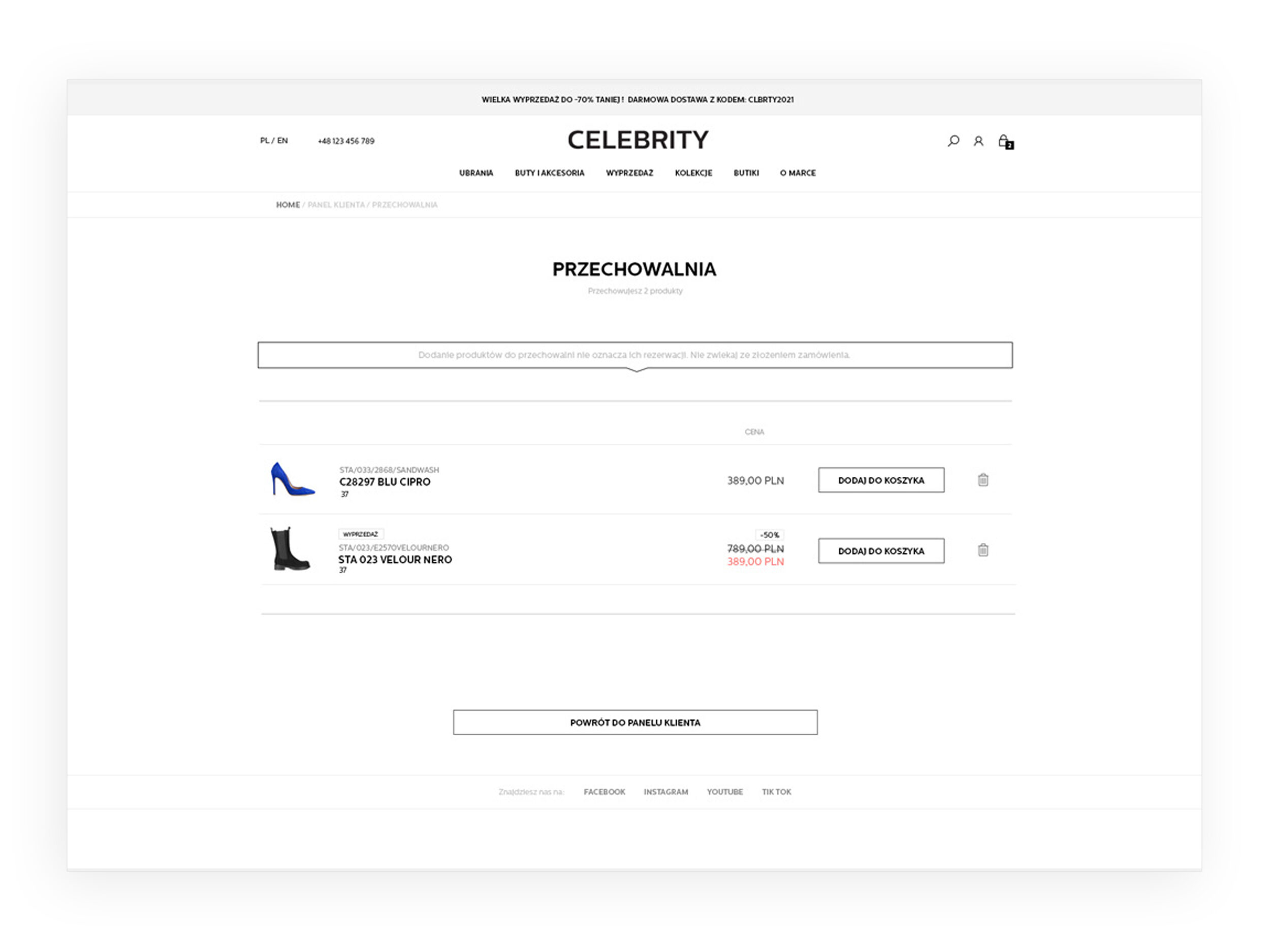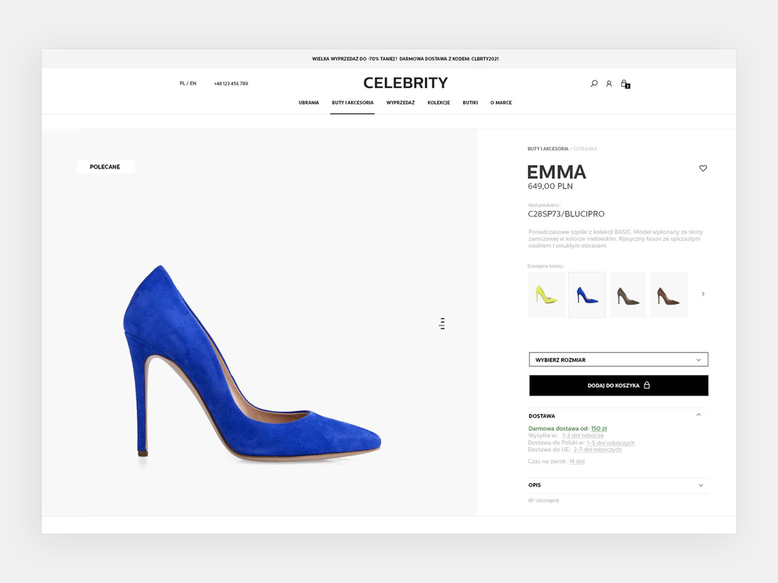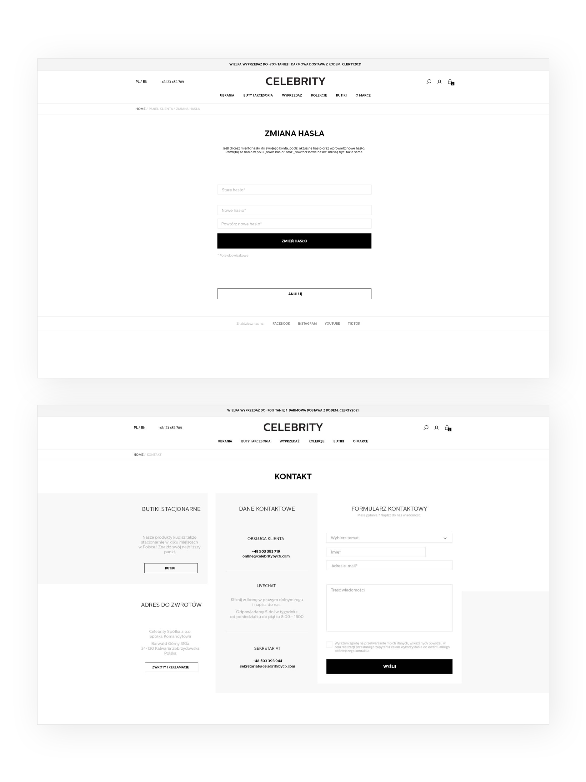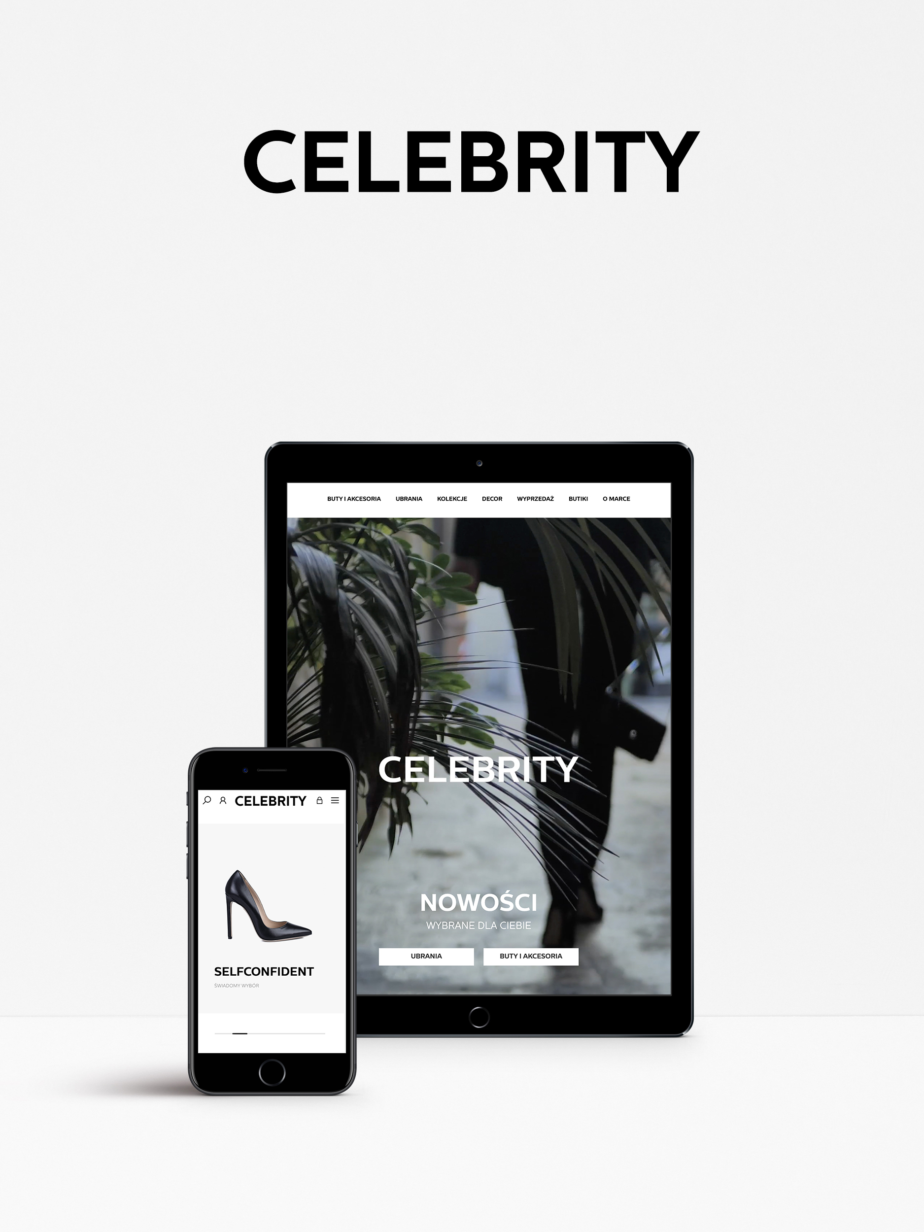 CELEBRITY to marka luksusowego obuwia i odzieży. Nowy projekt sklepu online powstał w wyniku miesięcy intensywnych prac w moim warsztacie graficznym. Dziesiątki godzin rozmów i dopracowywania szczegółów zaowocowały ponad 30 unikalnymi widokami – od pop-upów, przez szablony e-mail, po indywidualne projekty każdej podstrony - w tym także dla wersji mobilnej.