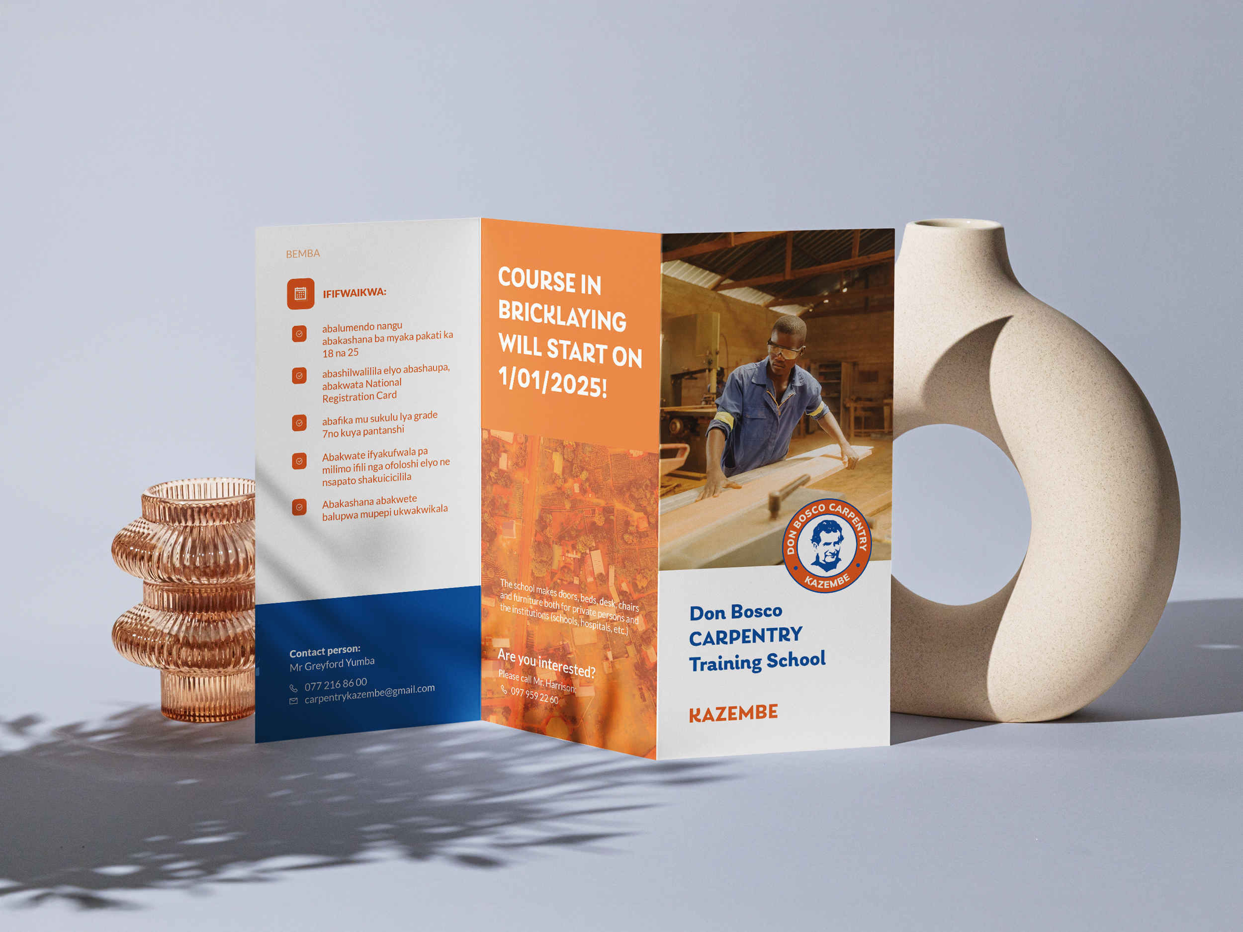 Dla szkoły zawodowej Don Bosco Carpentry w Kazembe (Zambia) przygotowałam ulotkę oraz identyfikację wizualną obejmującą projekt wizytówek i papieru firmowego. Całość utrzymana jest w profesjonalnym i spójnym stylu, odzwierciedlającym rzemieślniczy charakter szkoły.