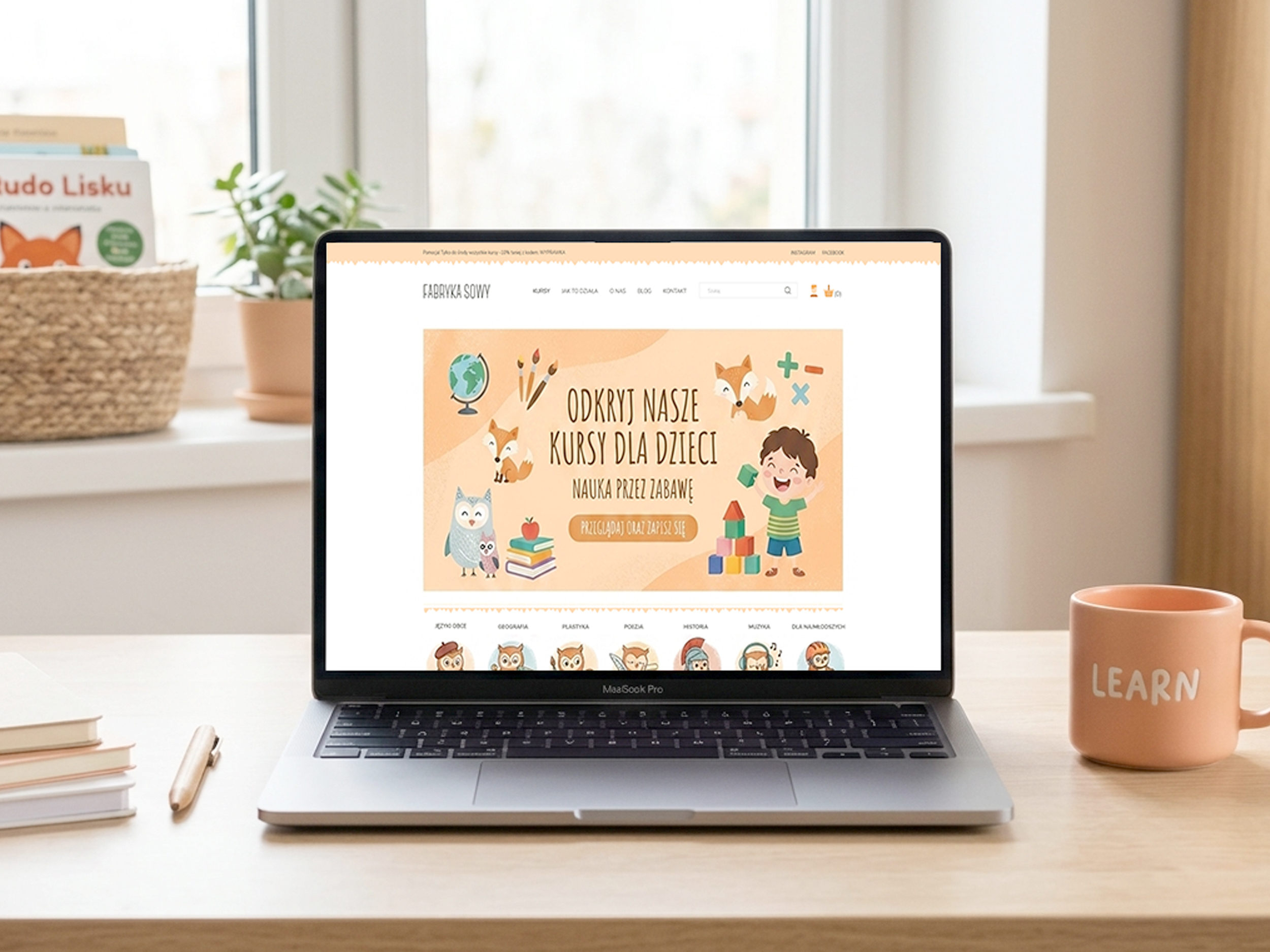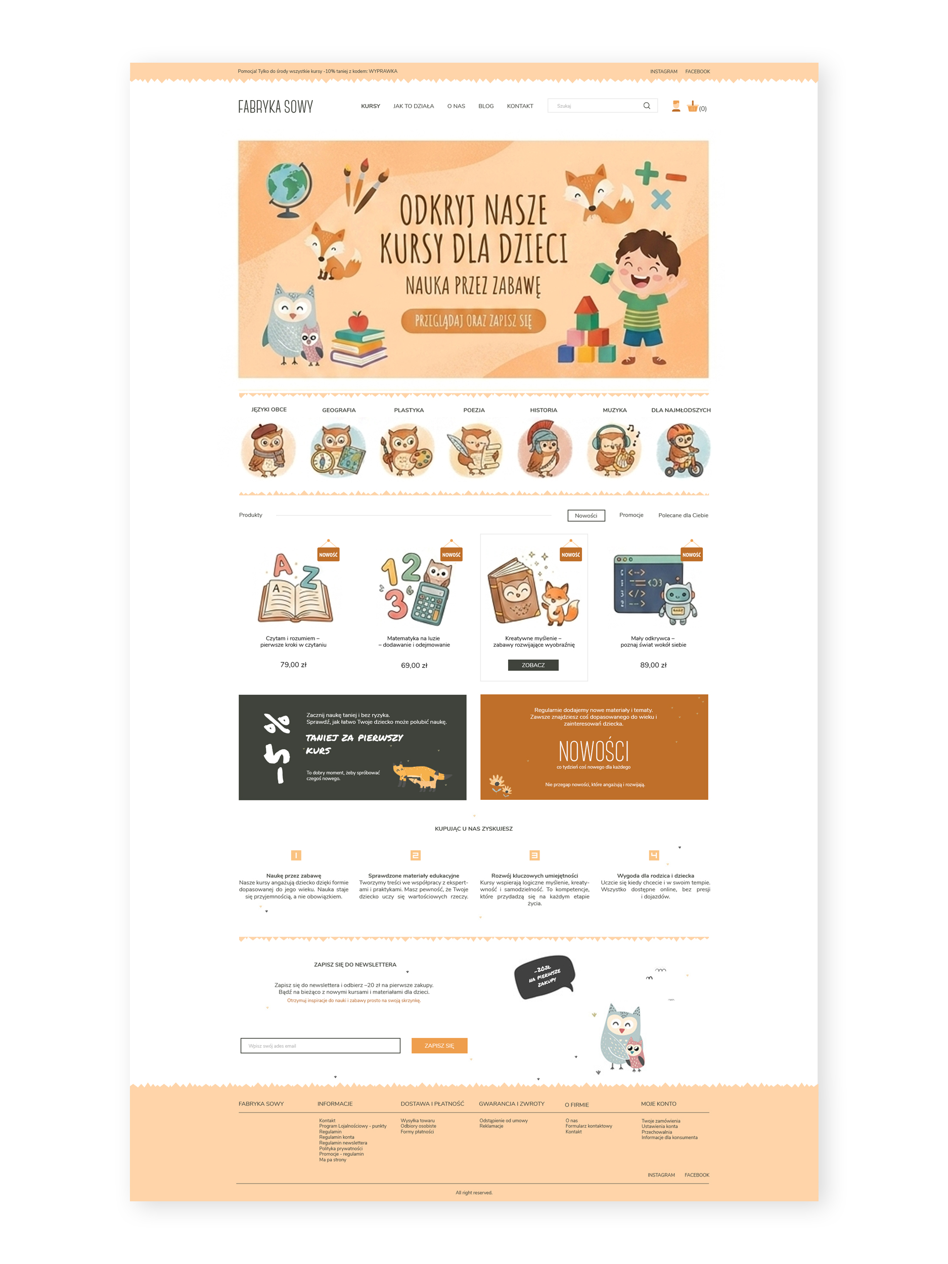 Na potrzeby marki Fabryka Sowy stworzyłam projekt graficzny sklepu internetowego oferującego kursy online dla dzieci i młodzieży. Projekt został utrzymany w ciepłej, przyjaznej kolorystyce opartej na odcieniach beżu, brązu i brzoskwini, które budują atmosferę sprzyjającą nauce i rozwojowi. Motywem przewodnim identyfikacji została sowa — symbol wiedzy i mądrości — pojawiająca się w elementach wizualnych sklepu. Całość została zaprojektowana z myślą o przejrzystości oraz intuicyjnej nawigacji, ułatwiającej użytkownikom zapoznanie się z ofertą kursów.