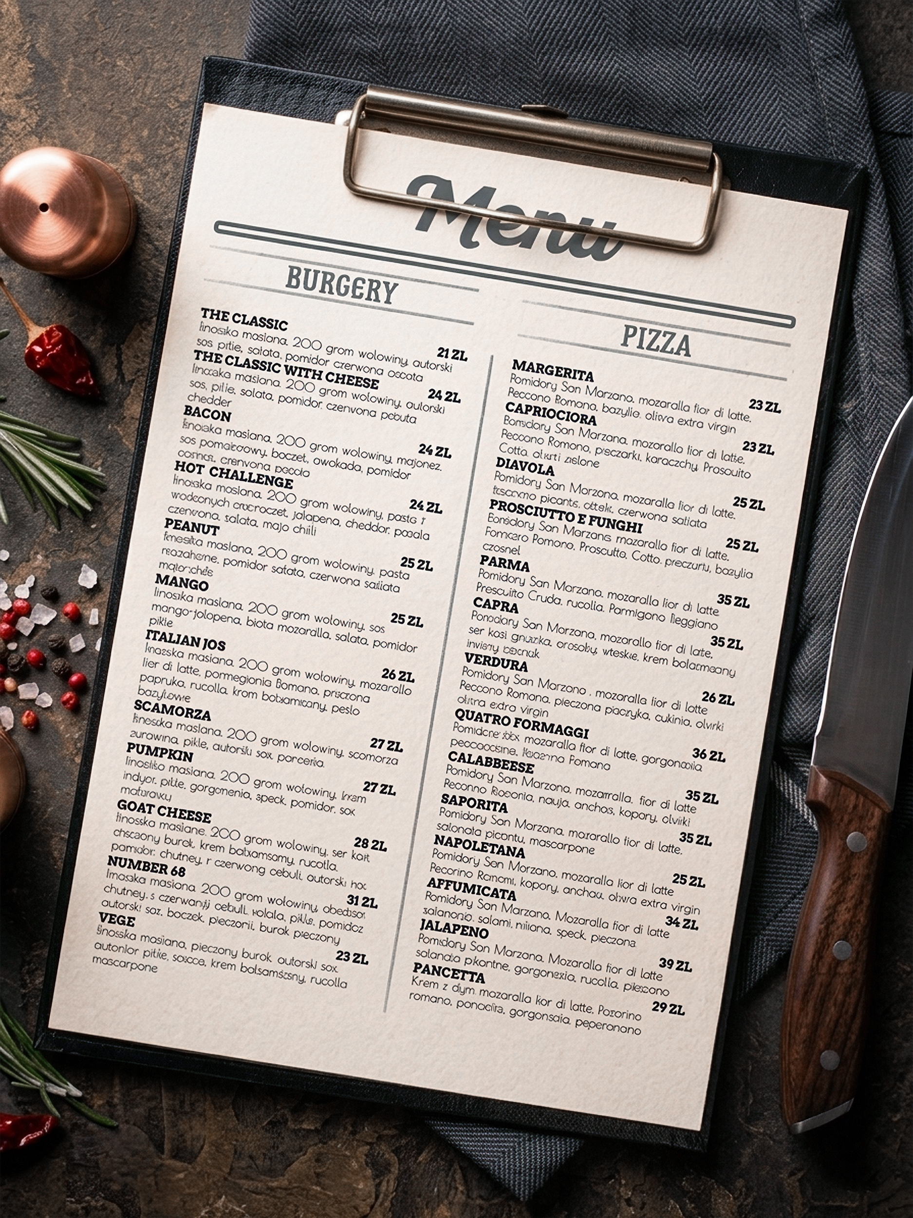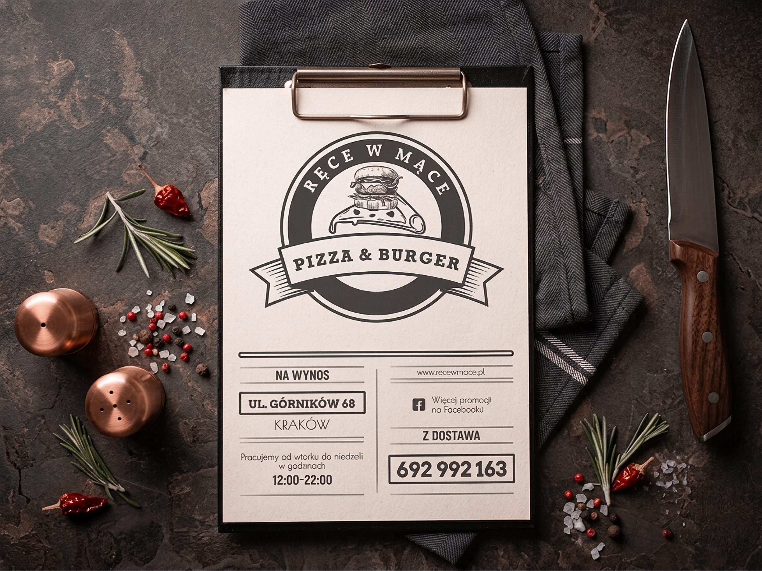 Stworzyłam ulotkę dla krakowskiej restauracji "Ręce w mące", specjalizującej się w pizzy i burgerach. Ulotka została zaprojektowana w stonowanej, szarej kolorystyce, która podkreśla rzemieślniczy charakter lokalu i wyróżnia go wśród konkurencji. Projekt ulotki łączy estetykę z funkcjonalnością – przejrzysty układ menu i wyrazista typografia ułatwiają odbiór treści.